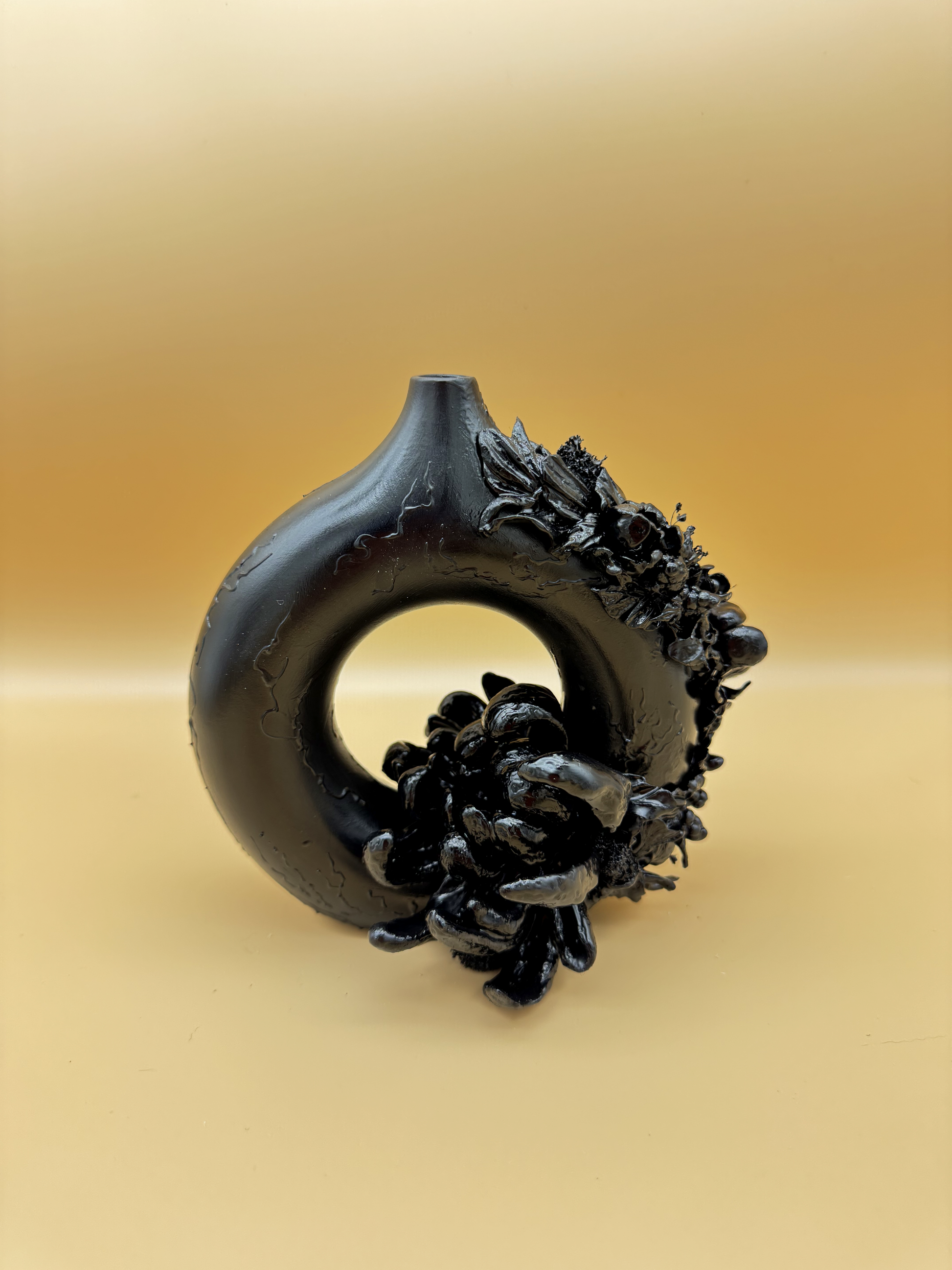 Obsidian Bloom is an exploration shadow and form, stillness and growth. This vase with intricate handcrafted detailed, is sculpted in deep black, its surface alive with intricate reliefs of flowers, leaves, and organic shapes that seem to bloom from the darkness itself.