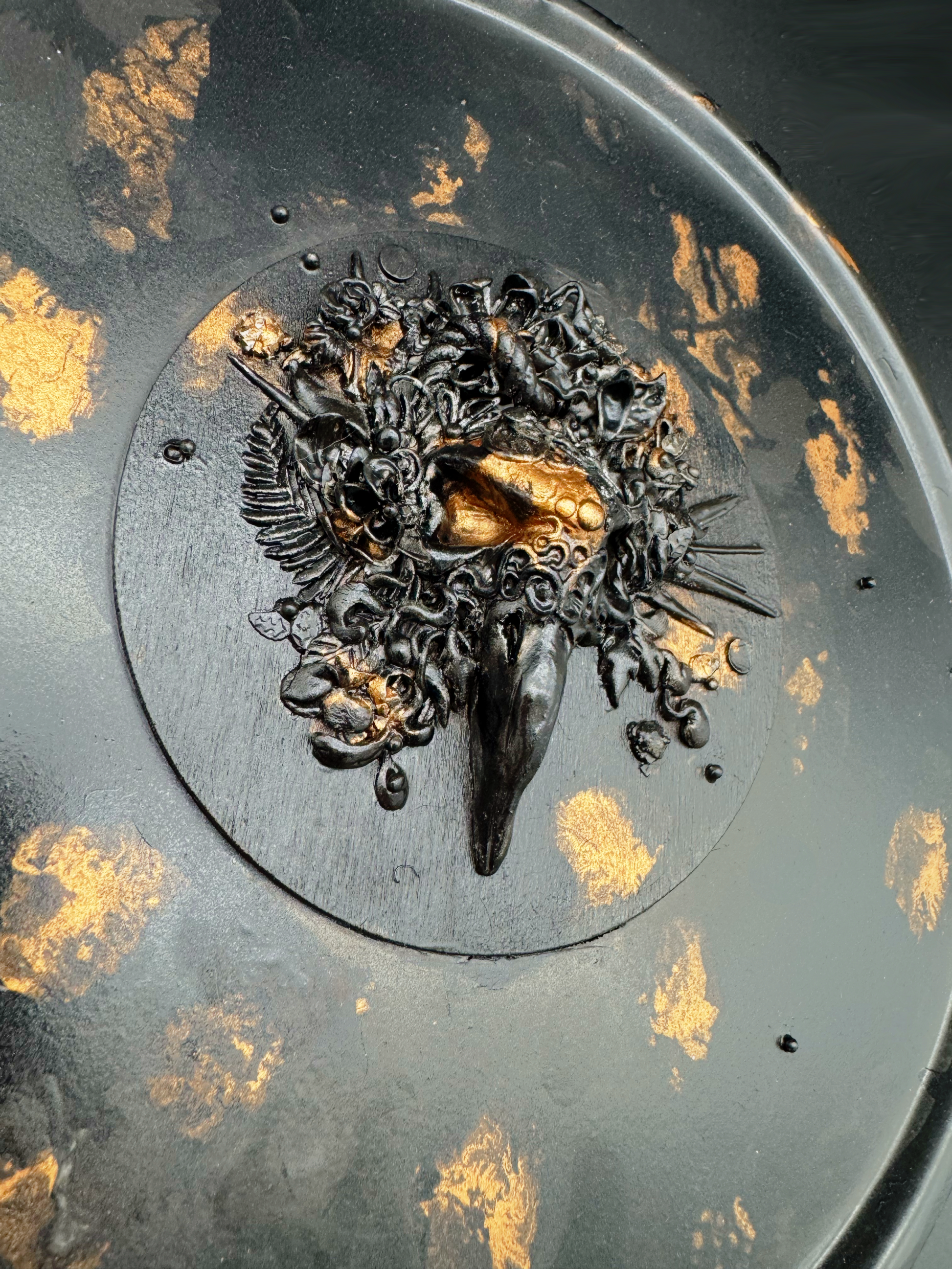 Raven’s Mark captures the haunting beauty of transformation — a convergence of decay, memory, and light. This one-of-a-kind wall piece features a sculpted bird skull emerging from an intricate relief of organic forms, set against a hand-finished metal plate.